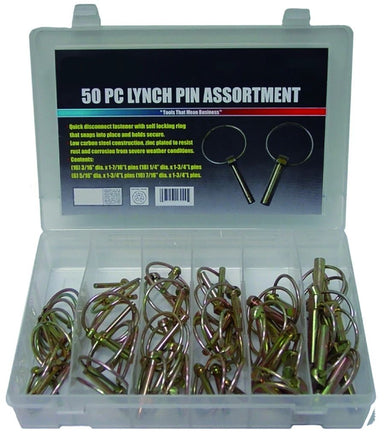 Lynch Pin Assortment - 50 PiecesQuick disconnect fastener with sell locking ring that snaps into place and holds secure.Low carbon steel constructi...