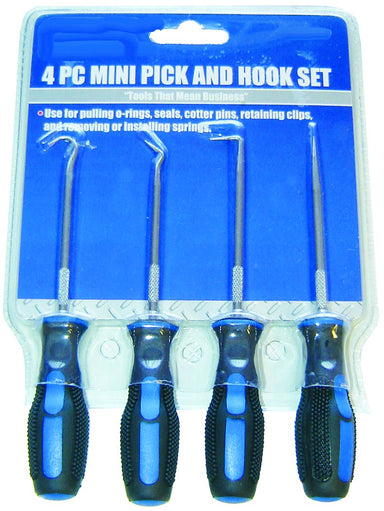 Mini Pick and Hook Set - 4 PiecesUse for pulling o-rings, seals, cotter pins, retaining clips and removing or installing springsSpecifications Bra...
